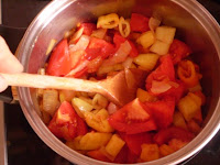 7) A felvágott paprikát és paradicsomot tedd a fazékba.